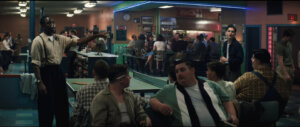 Walking into the converted Bowlero where they shot the first scene, Simon was floored by the set. “Each individual looked like they were from the 1950s, and yet their outfit was distinctly their own,” he recalled. Miyako Bellizzi, the costume designer, had fitted him in a striped button-up and faded blue work pants; Simon’s hair was slicked back and to the side.