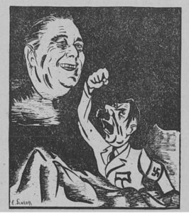 For those who cannot rise to Walz’s ultimate marathon challenge of all work and no sleep, and would prefer to take to your bed, Yiddish is not sympathetic. You’d be encouraged to shlof gikher, men darft di kishins! meaning, “sleep faster, we need the pillows.” And we wouldn’t wish that on the newest nominee whose satiric bursts recall a cartoon published in a 1941 Forverts by Latvian Jewish refugee and noted political illustrator Ezekiel Schloss depicting American President Roosevelt haunting Hitler’s fascist sleep.