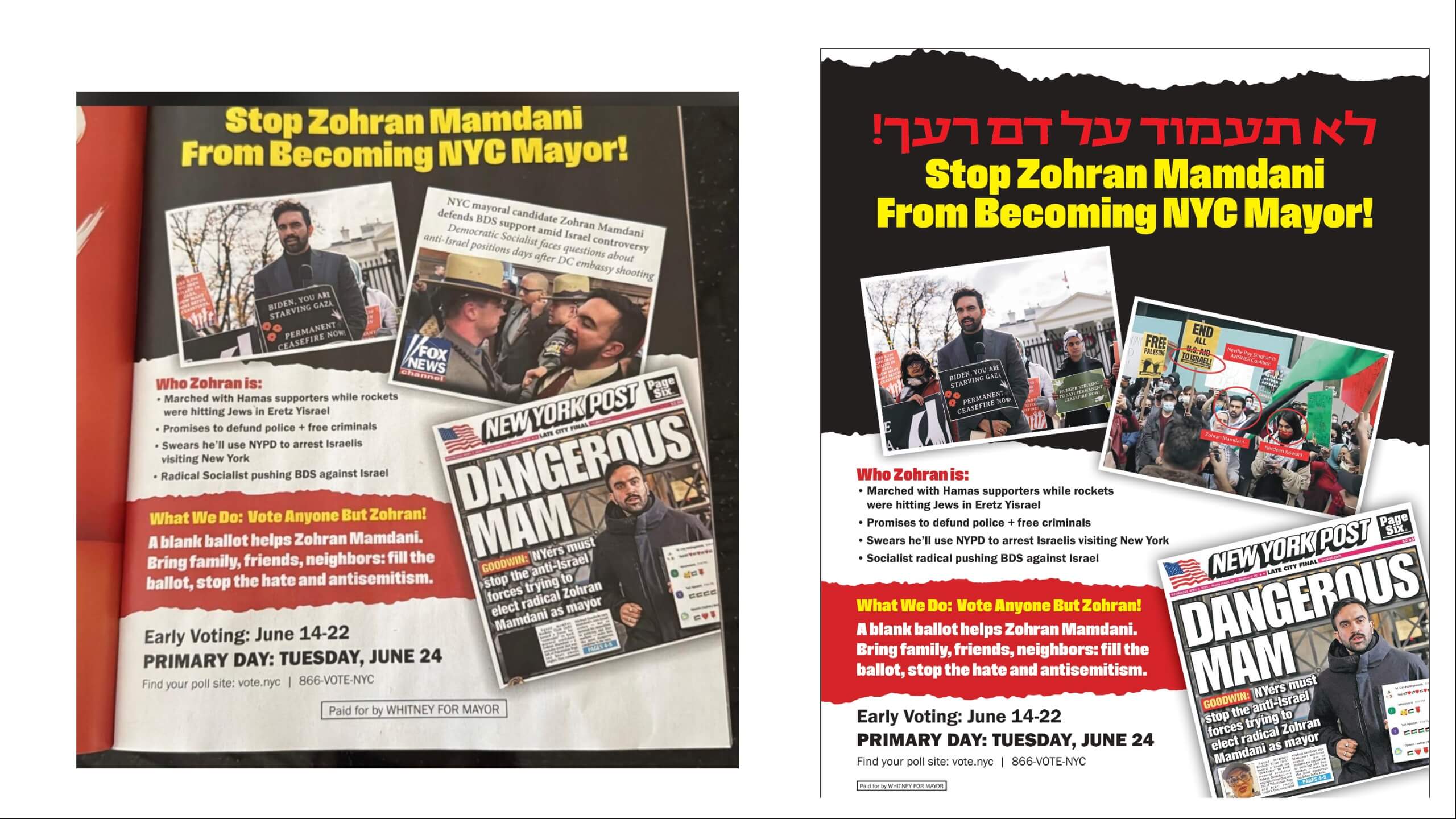 “Vote anyone but Zohran,” the ad says. “A blank ballot helps Zohran Mamdani. Bring family, friends, neighbors: fill the ballot, stop the hate and antisemitism.” A similar ad in the conservative Ami Magazine cites Mamdani’s defense of the BDS movement.
